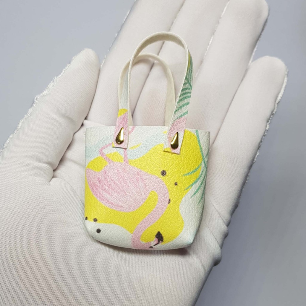 کیف مینیاتوری عروسک، دارای طرح رندم از برگ انجیری و فلامینگو است.