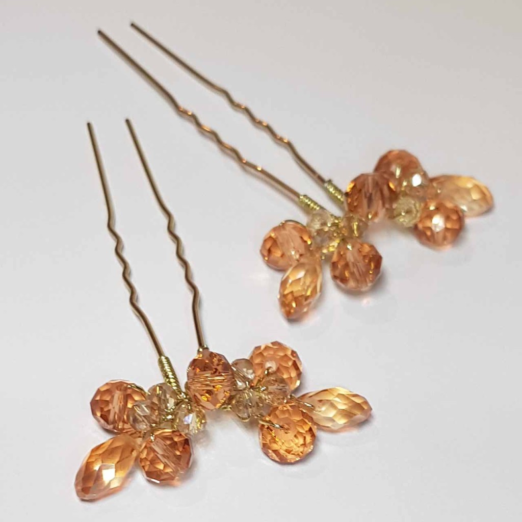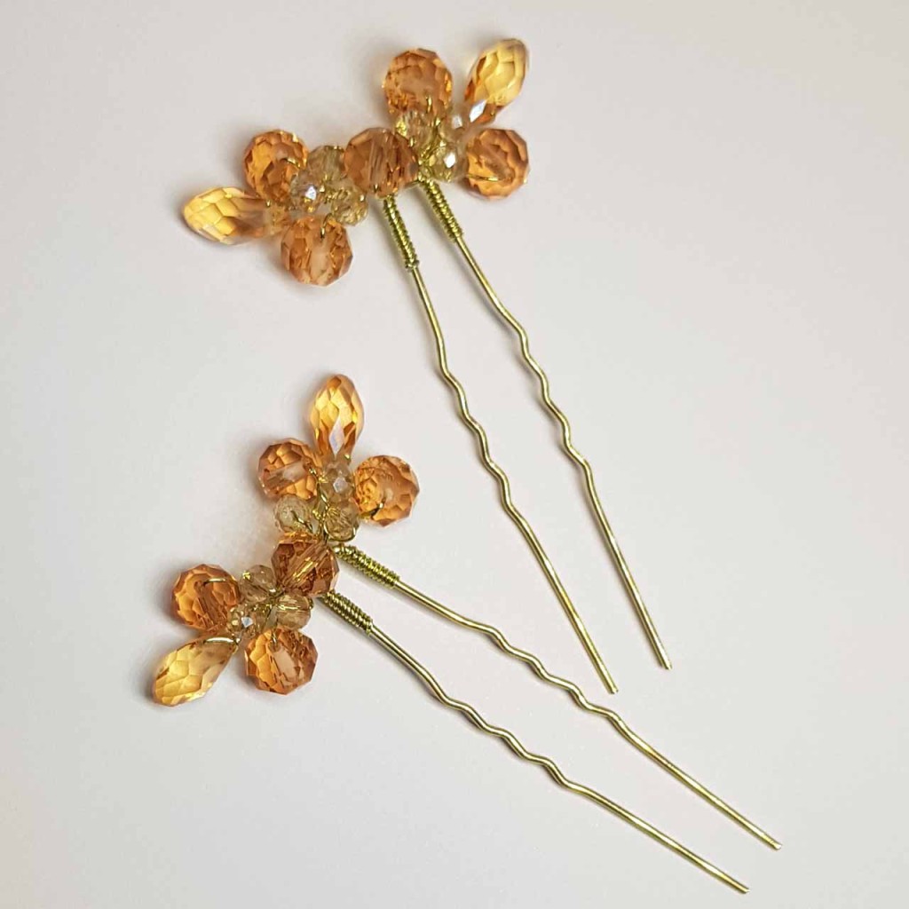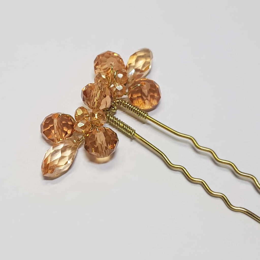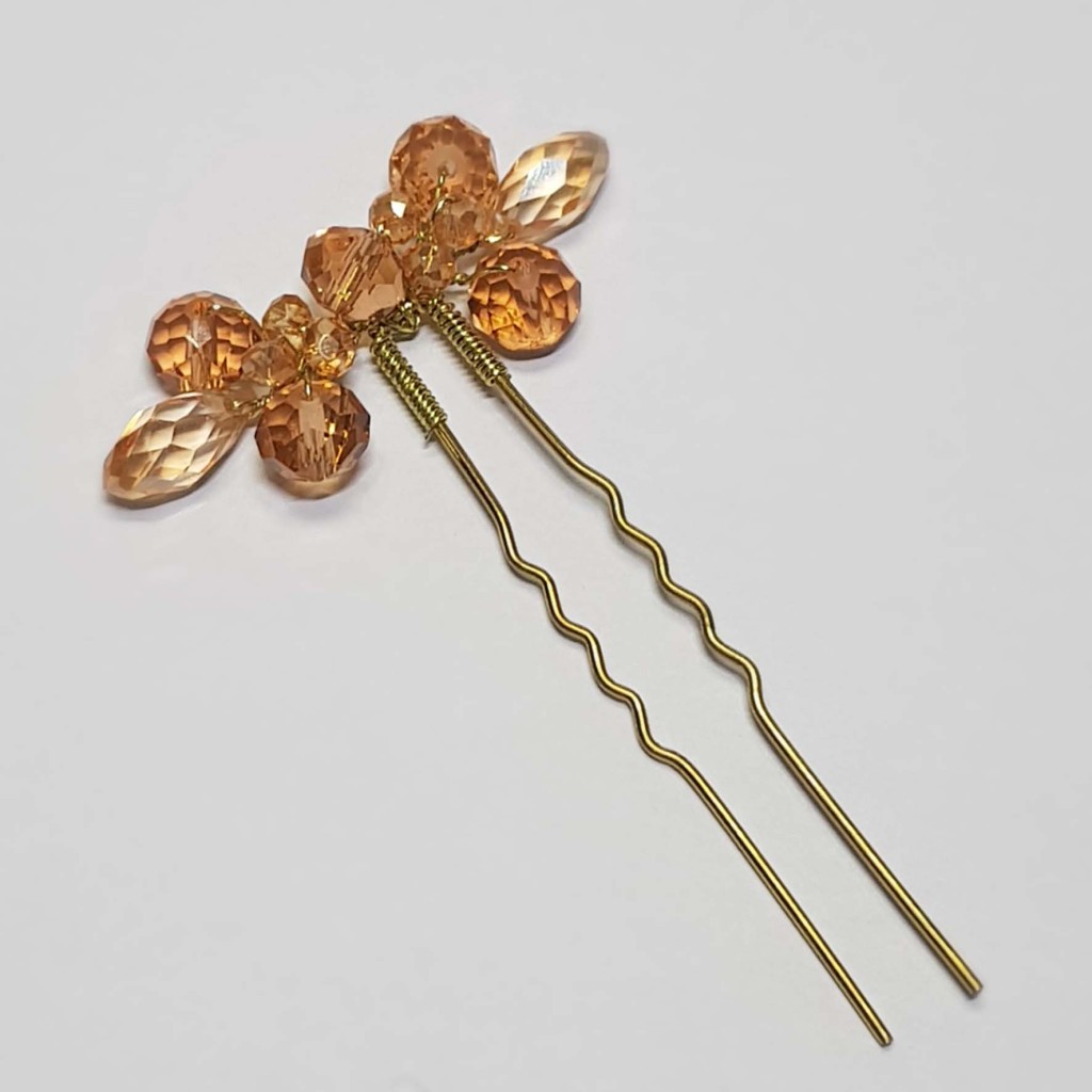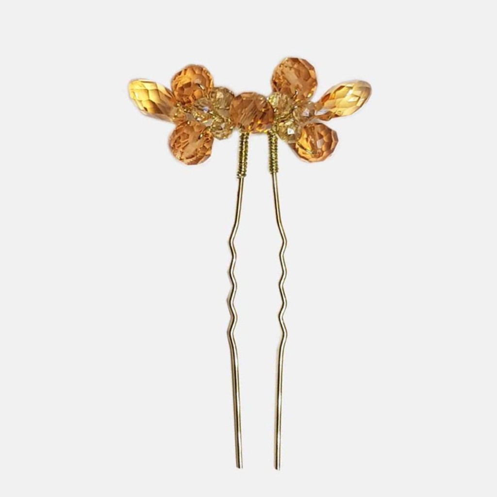این محصول یک سنجاق شینیون با کریستال های کهربایی رنگ است.